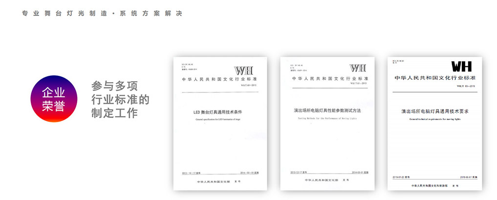 歐瑪燈光參與制定了電腦燈及LED燈具等多項(xiàng)行業(yè)標(biāo)準(zhǔn),通過了ISO9001、ISO14001、OHSAS18001管理體系,多次獲得“演藝設(shè)備優(yōu)質(zhì)產(chǎn)品獎”“PALM展產(chǎn)品技術(shù)一等獎” 2016年 被評為“中國演藝設(shè)備新銳企業(yè)”。歐瑪燈光先后成為中國演藝設(shè)備技術(shù)協(xié)會監(jiān)事單位、中國舞臺美術(shù)學(xué)會理事單位,廣東演藝設(shè)備行業(yè)商會監(jiān)事長單位,廣東省舞臺美術(shù)研究會副會長單位,飛利浦照明特殊光源舞臺娛樂OEM戰(zhàn)略合作伙伴等;獲得演藝設(shè)備工程綜合技術(shù)能力燈光壹級,中國舞臺美術(shù)學(xué)會專業(yè)舞臺燈光、音響、舞臺設(shè)計、安裝及調(diào)試資質(zhì)等級甲級等證書.