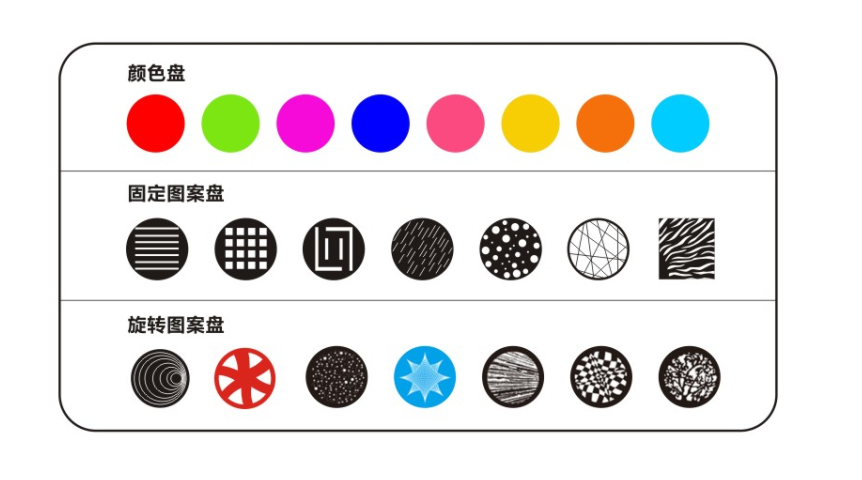 · 1個(gè)固定圖案盤(pán):6個(gè)金屬圖案+一段局部動(dòng)感紋理+空白;帶圖案抖動(dòng)功能